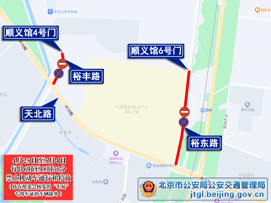 4月25日至5月4日,每日6时至18时30分,裕东路由天北路与裕东路交叉口(不含)至顺义馆6号门,裕丰路由天北路与裕丰路交叉口(不含)至顺义馆4号门,除持有组委会核发的“车展”专用车证的车辆外,禁止其他机动车通行和停放。P8社会停车场周边的安毓街、裕安路、裕丰路和P9停车场周边的裕曦路、规划南路禁止机动车停放。